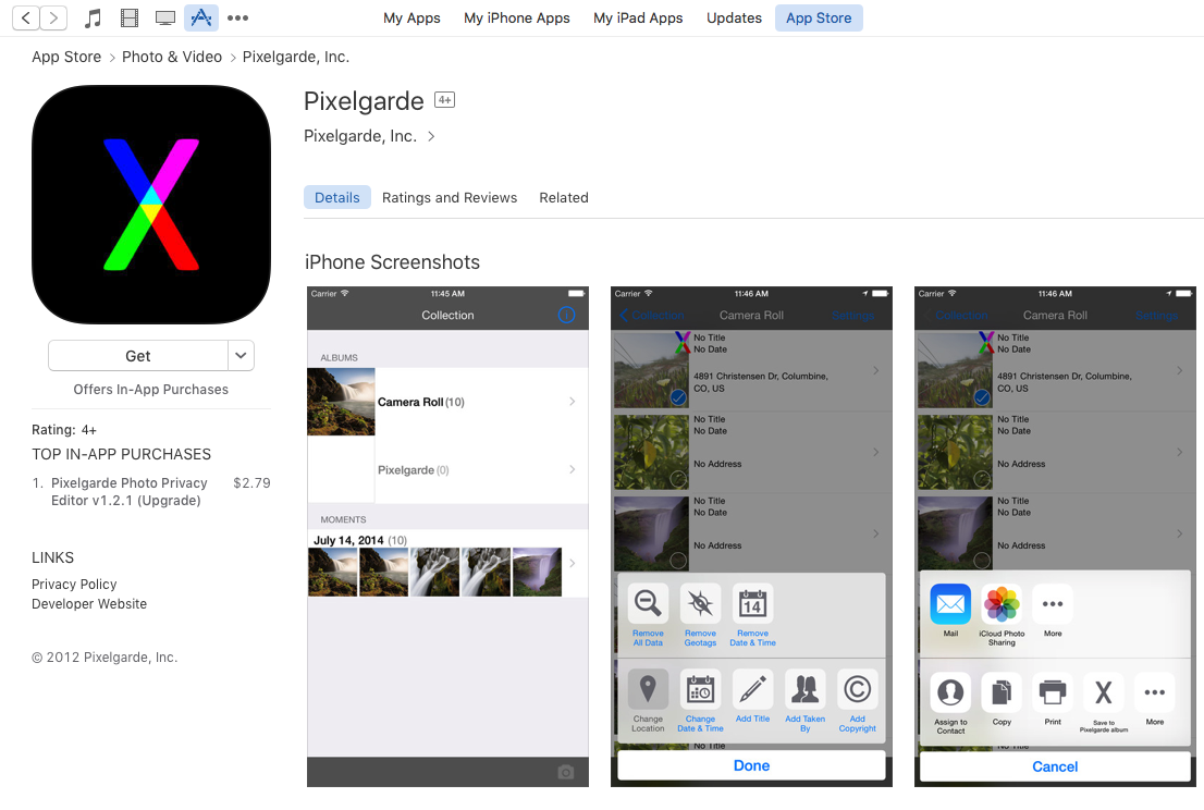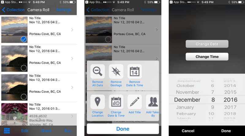 The easiest fashion to do this is to download Pixelgarde, a gratis app which lets you lot add together, remove or alter geotags, dates, times of twenty-four hour period, and other metadata in your photos and videos. Pixelgarde has a costless version of their app, but if y'all desire to remove their watermark, you can upgrade for $one.99!