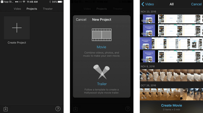 Download the gratuitous iMovie app on your iPhone (or Video Show on Android). Tap "Create Project" and so "Moving picture" to browse the photos and videos you have saved on your smartphone. Select the video you program to post to your Instagram Story and tap "Create Movie."
