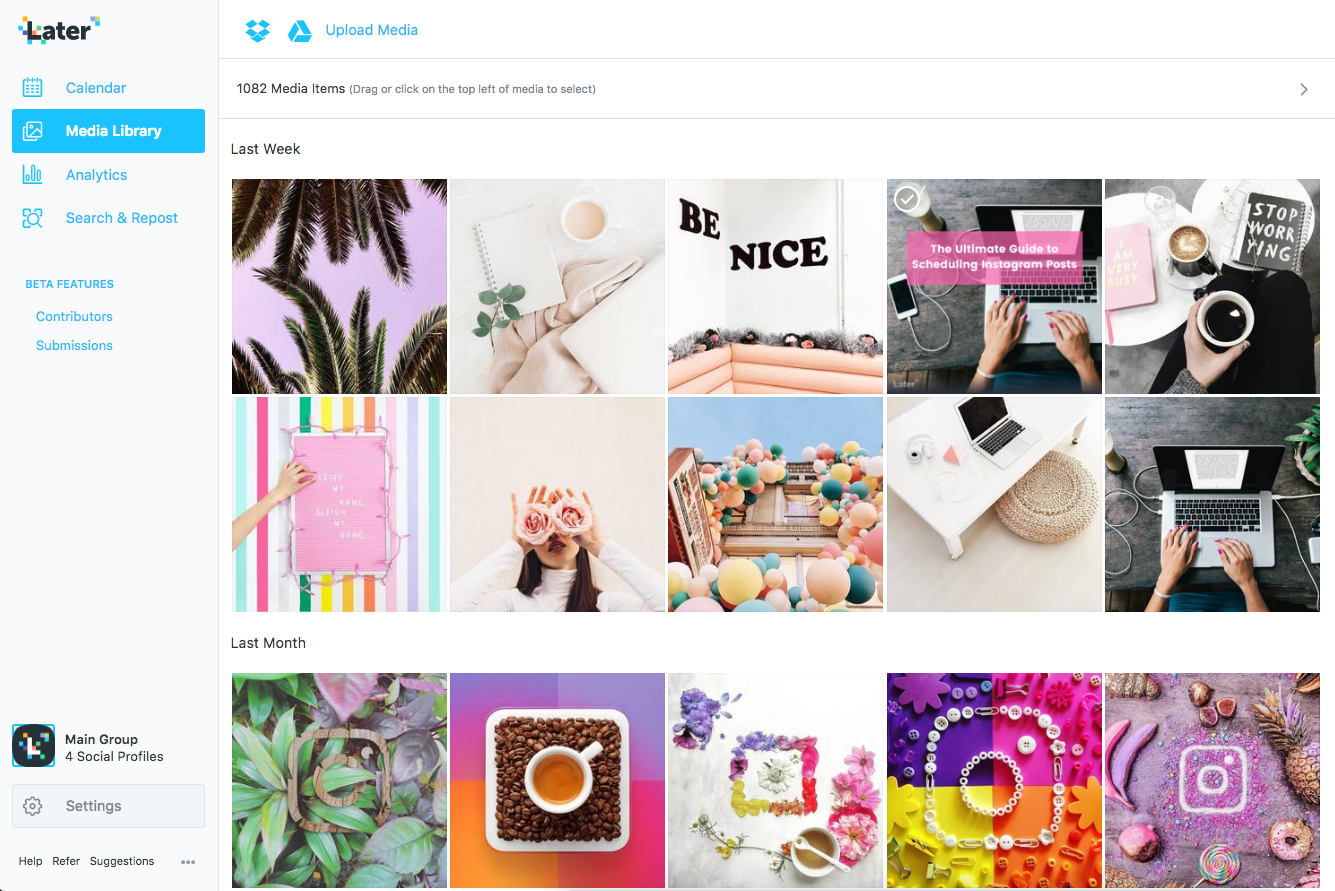 Starting time by downloading the Later app. In one case you're set up-upward, upload a photo or video to your media library from your desktop estimator (y'all can as well upload multiple photos and videos at one time using our bulk upload feature).